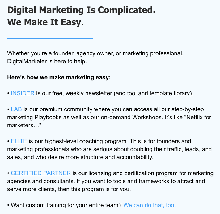 Since you’re leading your subscribers down a set path, you want your content to support your offer/products. For example, at DigitalMarketer we have a weekly newsletter called DM Insider with 4 sections: