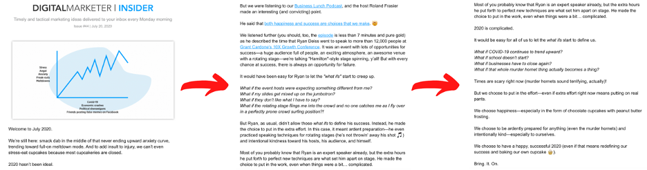 For DM Insider, we know that our customer avatar doesn’t want a 30-minute long read on the latest in marketing. They want Quibi-style quick bites they can read, think about, and then apply to the rest of their day. We’ve set up our newsletter in the template that works best for our customer avatar: 4 sections of useful, easy to digest content.