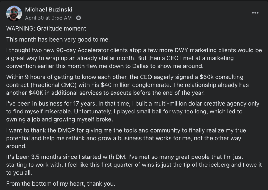 I don’t mean to toot our horn, but you can bet that after an experience like this, Michael “Buzz” Buzinski will be a lifetime DigitalMarketer member. With the right environment, you can grab tons of screenshots like this and, even better, videos!