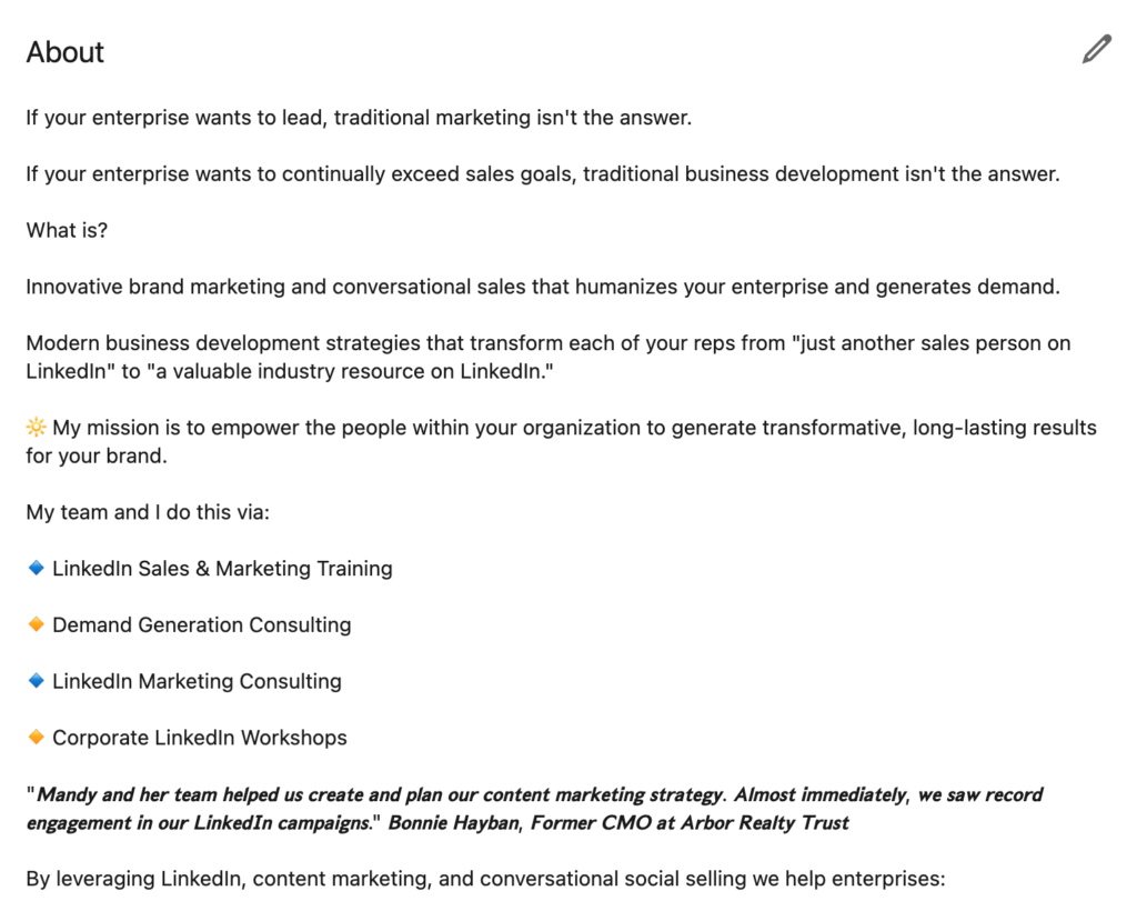 Use bullets and spaces to break up your About section and make it easy for people to read. You can see how I do this in my profile and use mine as a guide when optimizing yours.