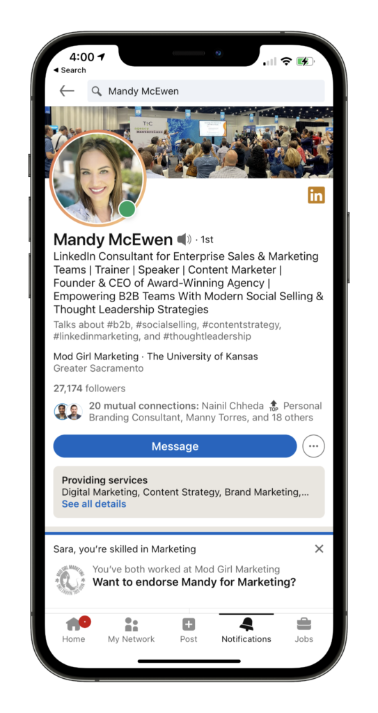 Mandy McEwen is a renowned LinkedIn consultant and Founder of Mod Girl Marketing. Named a top B2B marketer by LinkedIn, Mandy has helped thousands of businesses increase revenues online. She's a dynamic speaker and mentor with 8 digital marketing courses, an Inc-rated Facebook group, and a LinkedIn Live show. Mandy and her team partner with enterprise sales and marketing teams to harness the power of LinkedIn and humanized marketing.