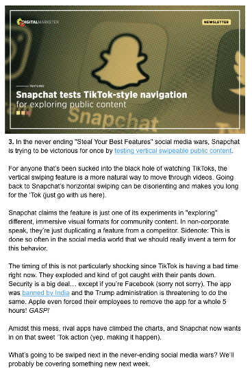 For DM Insider, we know that our customer avatar doesn’t want a 30-minute long read on the latest in marketing. They want Quibi-style quick bites they can read, think about, and then apply to the rest of their day. We’ve set up our newsletter in the template that works best for our customer avatar: 4 sections of useful, easy to digest content.