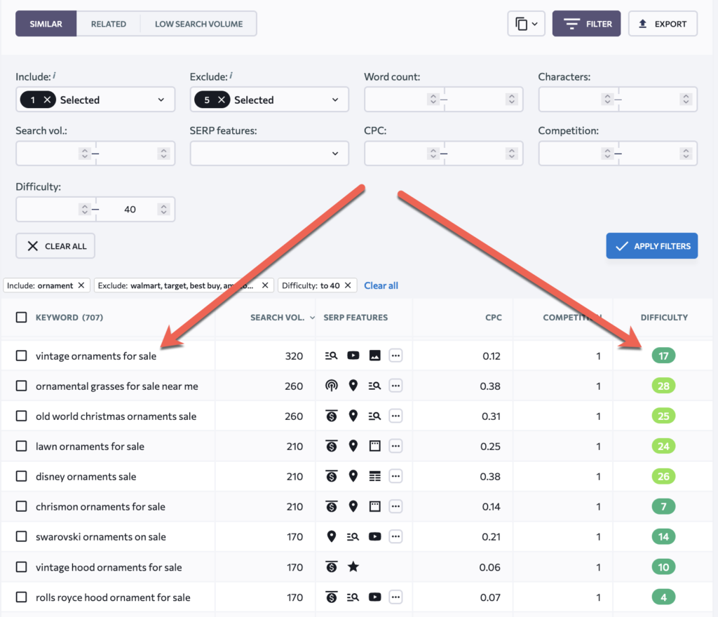 SE Ranking keyword suggestion tool allows you to research those new buying decisions by allowing you to filter out words you cannot compete with and focus on your niche. You can also filter results by difficulty to find search queries with lower organic competition:
