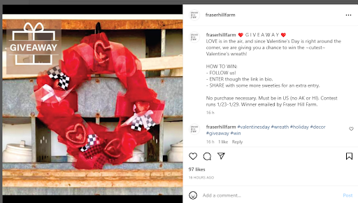 Encourage your audience to engage with your content by asking questions, starting a conversation, or running a contest. You can also host a giveaway as Fraser Hill Farm has done.