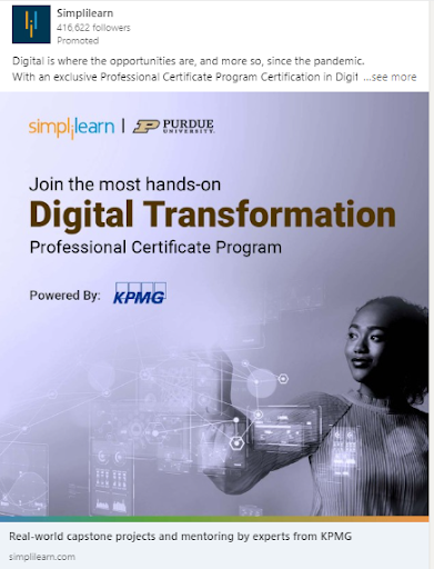 Simplilearn uses different types of social media content to boost engagement. This is a post on LinkedIn that promotes its professional certificate program.