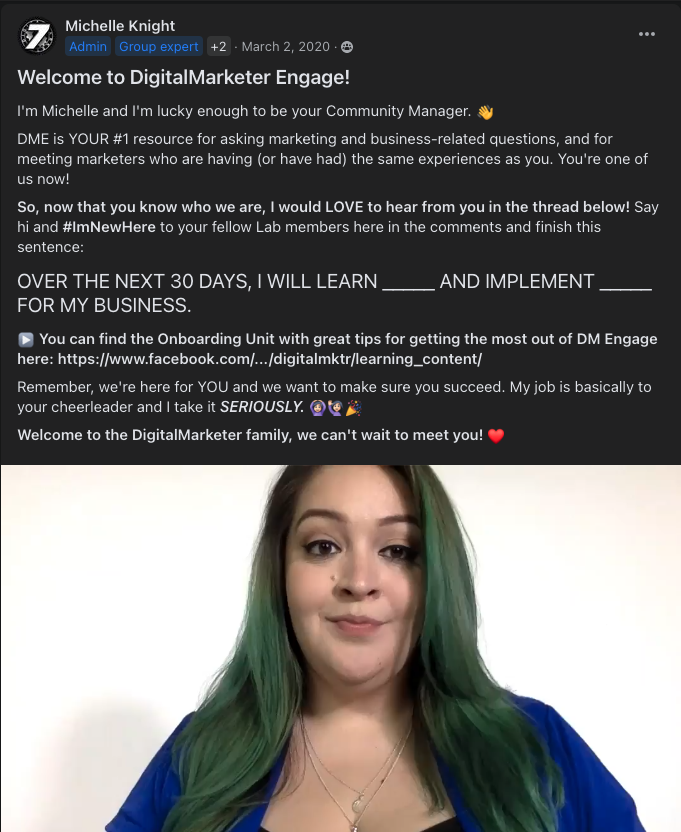 I am a big fan of simplicity, so I have a nifty welcome video with a CTA in our main Group, DM Engage for Lab Members. I tag in all new members to chime in and just give them an idea of what they’re about to get into.