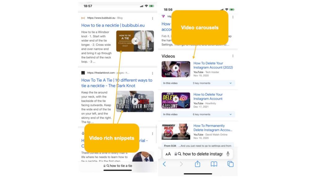 - Video carousels (or video packs): These are separate sections within organic search results, and they are pretty easy to capture. All you need is a traditional SEO.