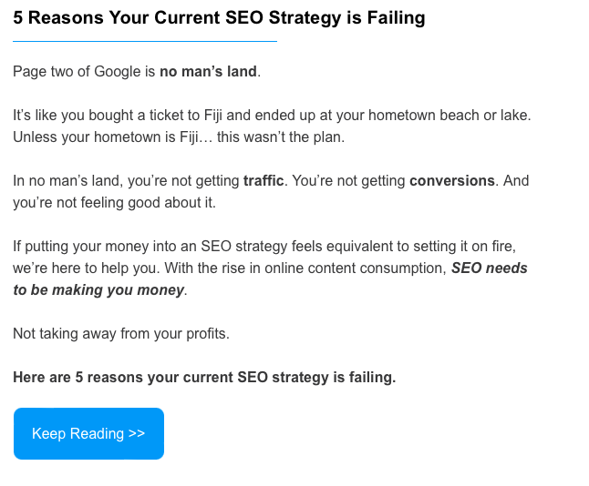 Or, as your promotional calendar starts rolling out, you now have lists of subscribers interested in those products or topics. Let’s say we surveyed our email subscribers and asked what they were struggling with the most and one of the answers was SEO. Every subscriber who answered SEO could be sent a DigitalMarketer Insider personalized to help them learn more about SEO, with content like this: