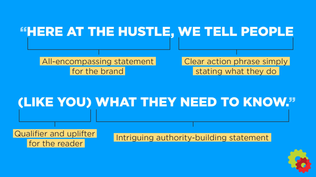 - Here at The Hustle – All-encompassing statement for the brand