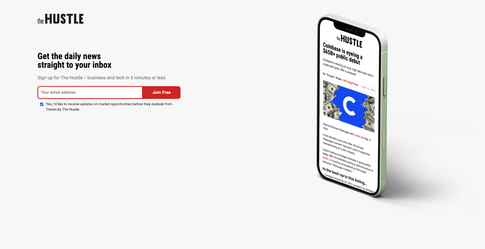 Before you do anything, you need to decide how much time and effort you’re going to dedicate to email marketing in general. If you’d like to know where it stands in The Hustle’s opinion, just check out their homepage: