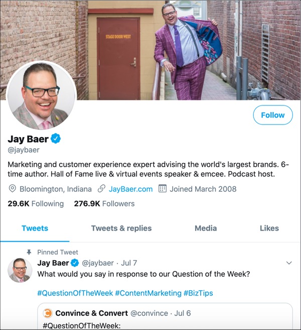 Baer primarily uses his Twitter page as a place to link to all of his live recordings, audio clips, and podcasts. He covers everything from B2B marketing tactics to LinkedIn advertising, and he’s a great follow for people who are interested in how to become better marketers.